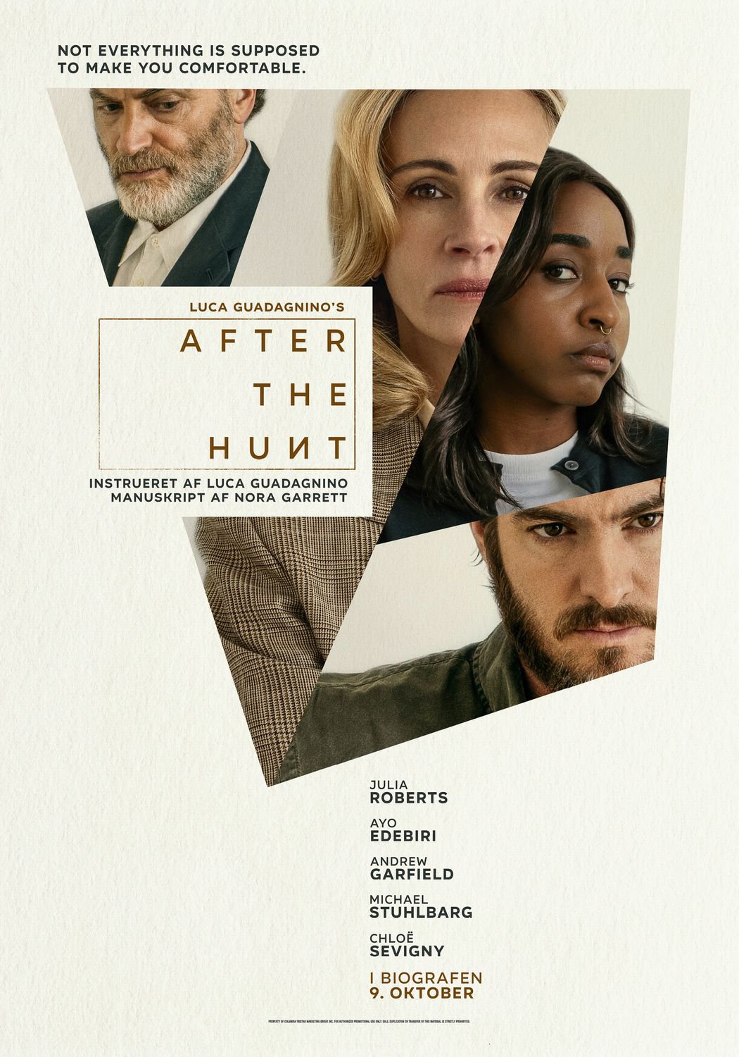 Den visionære filmskaber Luca Guadagnino (”Call me by your name”, ”Challengers”) står bag det gribende psykologiske drama AFTER THE HUNT om en universitetsprofessor (Julia Roberts), der pludselig står ved en personlig og professionel korsvej. Da hendes stjernestuderende (Ayo Edebiri) rejser en anklage mod en af hendes kolleger (Andrew Garfield), bliver hun uforvarende involveret og pludselig truer en mørk hemmelighed fra hendes egen fortid med at komme frem i lyset.